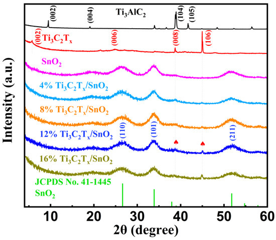 XRD patterns of the Ti3AlC2 MAX phase, Ti3C2Tx MXene nanosheets, pure SnO2 CQDs, and samples of Ti3C2Tx/SnO2 composites are shown in Figure 3. Following the removal of the aluminum atomic layers from the Ti3AlC2 MAX powder, a shift in the (002) peak from 9.5° to 5.7° was observed, indicating an increase in the interlayer distance of Ti3C2Tx MXene nanosheets and successful preparation of Ti3C2Tx MXene [38]. The XRD patterns of Ti3C2Tx MXene that appeared at 5.7°, 24.7°, 38.7°, and 44.9° corresponded to the (002), (006), (008), and (106) planes, suggesting that the 2D Ti3C2Tx MXene nanosheets were successfully delaminated from Ti3AlC2 MAX.