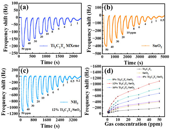 The real-time responses of the sensors based on Ti3C2Tx MXene, SnO2 CQDs, and Ti3C2Tx/SnO2 composites with different NH3 concentrations are shown in Figure 5a–c. When the sensors are exposed to ammonia, the work frequency of the sensors decreases, which is attributed to the mass loading effect [42]. Figure 5c illustrates the frequency response curves of the sensor of Ti3C2Tx/SnO2 composites upon exposure to NH3 of different concentrations (twelve different NH3 concentrations ranging from 200 ppb to 50 ppm). The frequency shift in the sensor (12% Ti3C2Tx/SnO2) to 50 ppm NH3 was −1140 Hz, which is 5.6 times larger than that of pure Ti3C2Tx MXene and 2.8 times higher than that of SnO2 CQDs. As the NH3 concentration decreased to 1 ppm, the sensor still exhibited a frequency shift in −120 Hz at room temperature, which is 7.9 times larger than the response of the MXene sensor. The specific response values at different NH3 concentrations are shown in Table S2.