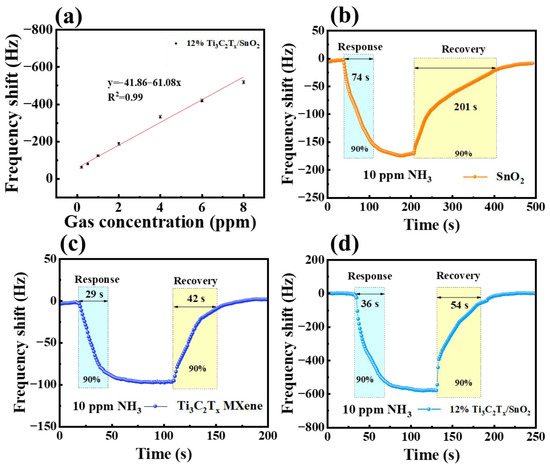 (a) Frequency shift of Ti3C2Tx/SnO2 sensor to NH3 concentrations varying from 200 ppb to 8 ppm. Response and recovery curves of (b) SnO2, (c) Ti3C2Tx, and (d) Ti3C2Tx/SnO2 composites.