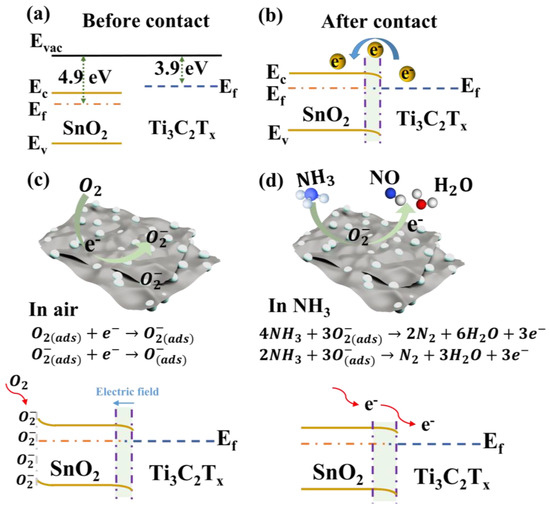 Energy band diagrams of SnO2 and Ti3C2Tx (a) before and (b) after contact. Schematic diagram of NH3 sensing mechanism of sensor based on Ti3C2Tx/SnO2 composites, (c) in air, and (d) exposure to NH3.