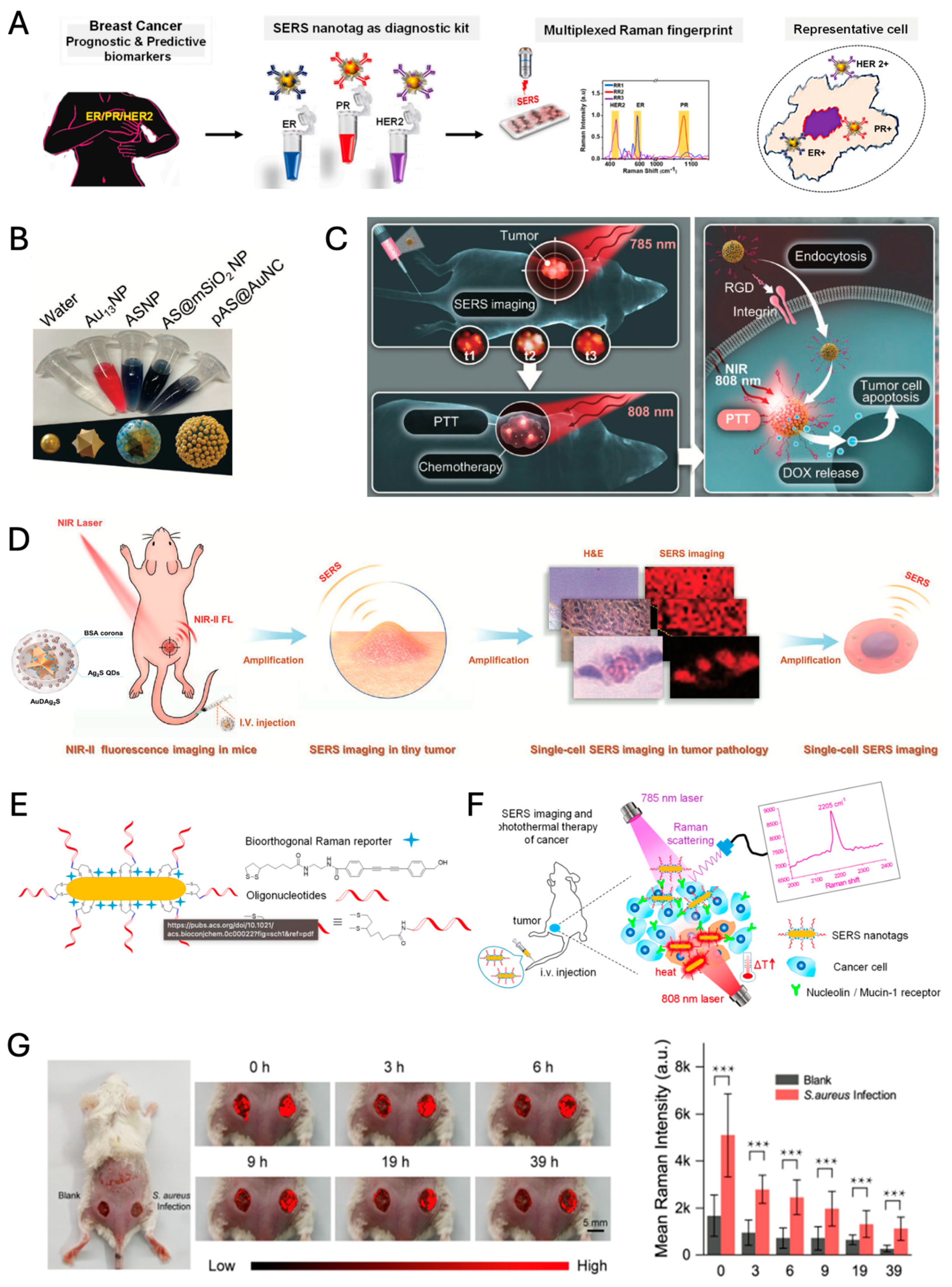 | AuNP@CV@PEG@anti-ER/PR/HER2 | ER/PR/HER2 | (1+, 2+ and 4+ tissue SERS imaging) | Recognized of 1+, 2+ and 4+ tissue SERS imaging | [130] |