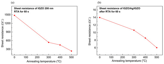 The sheet resistance of (a) IGZO and (b) IGZO/Ag/IGZO multilayers after varying temperature conditions.