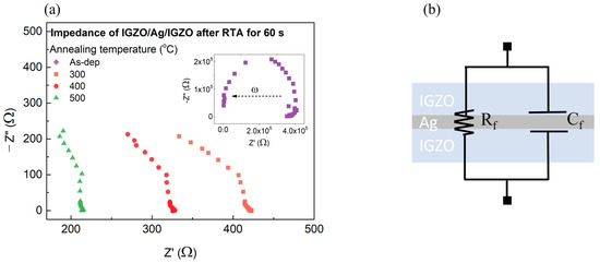 (a) Impedance of IGZO/Ag/IGZO after RTA RT to 500 °C for 60 s and (b) equivalent circuit of IGZO/Ag/IGZO.