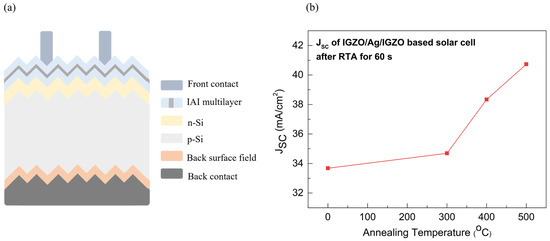 Based on these results, in order to evaluate the feasibility of IAI multilayer films as transparent electrodes for solar cell applications, we analyzed a photo-generated short circuit current (JSC) absorbed in a Si substrate using a PV light house simulator. Figure 6a shows the schematic structure of an IAI-based solar cell applied in the solar cell simulation. Figure 6b shows the JSC absorbed in the Si substrate as a function of annealing temperature. At the annealing condition of 500 °C or 60 s, it showed a maximum JSC of 40 mA/cm2. This trend is similar to the transmittance, reflectivity, and surface roughness previously mentioned. As the transmittance and reflectivity of the IAI multilayer improved, less light was lost to reach the Si substrate, leading to an enhanced optical efficiency. Therefore, our proposed IAI multilayer, optimized with the RTA process, is considered to show a high performance for solar cell applications due to its optical and electrical properties.