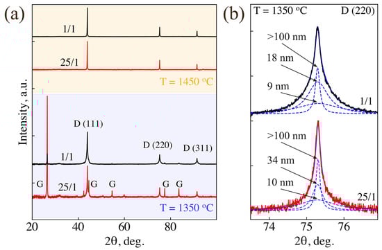 Figure 3a shows the XRD patterns of samples “1/1” and “25/1” synthesized at 1350 ± 50 and 1450 ± 50 °C. In both samples the graphite/diamond peak intensity ratio at 1350 °C is significantly less than at 1250 °C (Figure 1), and at 1450 °C graphite is not detected at all by XRD. At 1350 °C, the (220) diamond diffraction peaks are most accurately fitted by the superposition of three Lorentz profiles (Figure 3b). The widths of these three profiles correspond to the next average sizes of diamond crystallites: 9, 18, ≥100 nm for the sample “1/1” and 10, 34, ≥100 nm for the sample “25/1”. At the synthesis temperature of 1450 °C, the diffraction peaks narrow to values close to their instrumental broadening, when the Scherrer formula becomes inapplicable. In that case, the characteristic sizes of crystallites, lying in the range of 100–300 nm for both samples, were determined based on SEM data.