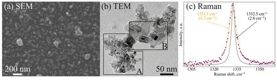 SEM, TEM images and Raman spectrum of the sample “25/1” synthesized at 1350 °C. (a) SEM image of diamond nanoparticles dispersed on a substrate from alcohol suspension. (b) TEM image of the ND agglomerate prepared by drying a drop of the suspension on a grid. The characteristic sizes of diamond crystallites are less than 10 nm in the marked area A, and 20–50 nm in the area B. (c) Typical Raman spectrum of the sample. The diamond peak (orange dotted line) is shifted to the position of 1332.1 cm−1 and broadened up to 5.7 cm−1 relative to the diamond peak (black line) recorded for the natural bulk IIa diamond.
