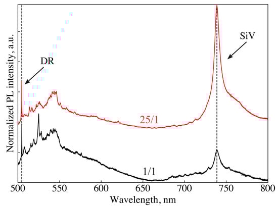 PL spectra of the samples synthesized at 1350 °C from adamantane/DND/tetrakis mixture at adamantane/DND weight proportions 25/1 (red) and 1/1 (black), and Si/C atomic ratio 1%. The spectra are normalized to the intensity of the diamond Raman (DR) line. Zero-phonon line of SiV− center and DR line are observed at 738.5 nm and 504.8 nm, respectively. “Palisade” of narrow lines observed throughout the range 500–800 nm is typical for N-doped H-terminated NDs [43].