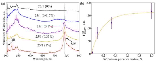 (a) PL spectra of the sample “25/1” synthesized at 1350 °C from adamantane/DND/tetrakis mixture with atomic ratio Si/C varying from 0% to 1%. The spectra are normalized to the intensity of the diamond Raman (DR) line. (b) The dependence of the integrated fluorescence intensity SiV− normalized to the DR line (IintSiV/DR) on the atomic ratio Si/C in the precursor. The statistical error in determining IintSiV/DR/DR was calculated based on averaging ten PL spectra for each of the five samples.