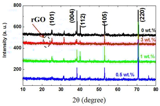 XRD patterns of TiO2 NTs/rGO nanocomposites grown with different rGO contents.