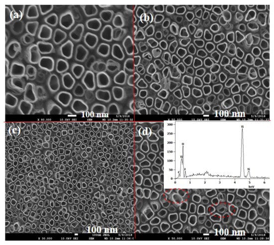 SEM images of TiO2 NTs/rGO nanocomposites with rGO contents of 0 wt.% (a), 0.5 wt.% (b), 1 wt.% (c), and 3 wt.% (d), respectively. Inset of Figure 3d shows the EDX spectrum of TiO2 NTs/rGO nanocomposites with rGO contents of 3 wt.%. The red circles in Figure 3d illustrate the structure of rGO surrounding the TiO2 nanotubes.