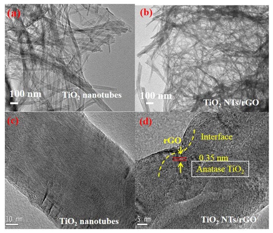 TEM (a,b) and high-resolution TEM (c,d) images of TiO2 nanotubes (a,c) and TiO2 NTs/rGO nanocomposites (b,d) with rGO contents of 1 wt.%.