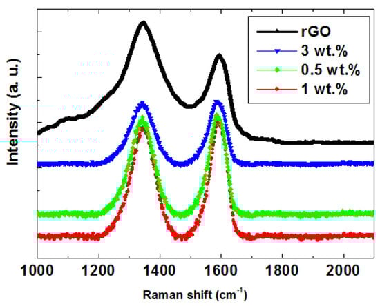 The Raman spectra of TiO2 NTs/rGO nanocomposites, as illustrated in Figure 5, reveal two prominent peaks corresponding to the D and G bands of graphene. The G band provides valuable information regarding the in-plane vibrations of sp2 bonded carbon atoms [32], while the D band is associated with some sp3 defects present in rGO [33]. The characteristics of Raman modes of anatase phase appeared at 146, 400, 518, and 636 cm−1 for pristine TiO2, and these peaks are well matched with Eg, B1g, A1g + B1g, and Eg modes of the anatase TiO2 phase [34]. As depicted in Figure 5, the G band for TiO2 NTs/rGO composites appears at 1597 cm−1, which is quite close to that of pristine graphene (1580 cm−1). The slight red shift observed in the G band for TiO2 NTs/rGO nanocomposites compared to GO (1591 cm−1) suggests a restoration of the π-π systems within graphene during the chemical reaction. Additionally, it is widely recognized that the ID/IG ratio serves as a valuable indicator of crystal quality within graphite structures. Our calculations indicate that the ID/IG ratio for 3 wt.% TiO2 NTs/rGO (1.26) exceeds that of 0.5 wt.% TiO2 NTs/rGO (1.14), signifying a stronger D band signal and thus confirming successful incorporation of rGO into these nanocomposites. Additionally, spectral characteristics suggest an increase in defect point density on the resulting rGO sheets, which may serve as ideal adsorption–desorption sites for TiO2 nanotubes [31].