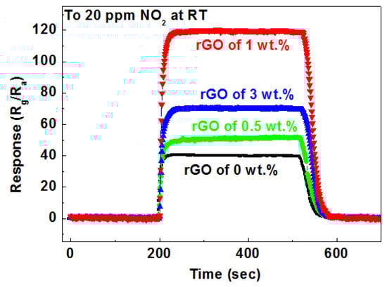 The relationship between the response and NO2 concentration for the sensor based on TiO2 NTs/rGO nanocomposites at room temperature is illustrated in Figure 7. It can be observed that the response increases with NO2 concentration, ranging from 1 ppm to 50 ppm. Notably, the TiO2 NTs/rGO nanocomposite with contents of 1.0 wt.% exhibited the highest response value, reaching an impressive 138 at a NO2 concentration of 50 ppm. The limit of detection was determined to be 1 ppm, and it is worth mentioning that the sensor demonstrated a remarkable response of 19.1 for just 1 ppm NO2 when utilizing the TiO2 NTs/rGO composite with rGO contents of 1.0 wt.%.