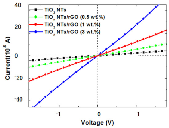 I-V curves of the sensor based on TiO2 NTs/rGO nanocomposites with different rGO contents.
