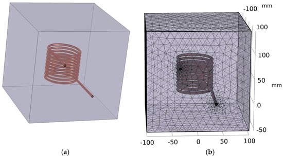 A typical solenoid shape was chosen because it preserves the direction of the magnetic field within its interior [24]. The coil itself is composed of hollow copper tubes with an inner radius of 1.5 mm and thickness of 1 mm, into which a water pumping system is connected to control temperature changes due to the Joule effect. To complete the geometry step, the coil was placed inside a parallelepiped domain composed of air. The example of S5 is depicted in Figure 1. The simulation of the magnetic field was performed with a finite element method (FEM), where the domain is discretized into small triangular elements. In each element, the magnetic field is computed through a frequency domain solver. In our simulation, we employed a dense mesh to accurately capture the system’s complexities. For the copper tube and the water domain, we implemented a specialized boundary condition designed to effectively simulate the skin depth effect associated with the electric current. This approach allowed us to better represent the penetration of the current into the conductive material, ensuring a more realistic analysis of the interaction between the copper tube and the surrounding water. In total, the mesh consists of 365,281 elements with a minimum relative quality of 0.178 and an average quality of 0.6485, being totally composed of 3 main domains (water, coil, air), 18 faces, 36 edges, and, finally, by 24 points.