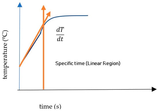 The heating efficacy is represented by the specific absorption rate (SAR) value, expressed in W/g(Magnetic NanoParticles). This value corresponds to the amount of energy converted into heat (J) per unit time (s) and mass (mmag) of the magnetic material. The SAR was calculated using the initial slope method (Figure 2), which considers the first few minutes (Equation (6)) within the linear variation range of the heating curve (adiabatic regime). This period is typically set at 100 s based on theoretical assumptions (low frequency and magnetic field).