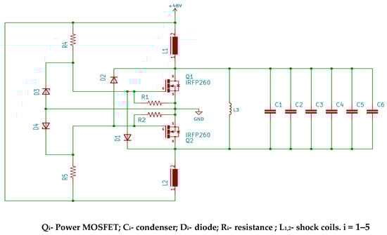 The power source was carefully chosen to ensure the required voltage (ΔV) for generating an electric current capable of creating a high-intensity magnetic field. The specific MOSFET selected, IRFP260, can handle a maximum current of 60 A and support a voltage of 200 V.