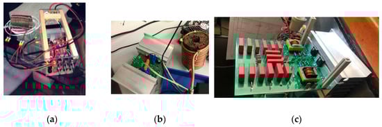 (a) Initial prototype of our system, (b) the system being currently applied, (c) a new and more powerful prototype system (resonant) that is being tested.