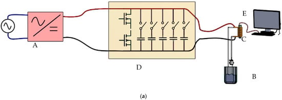 The experimental program initiated with the establishment of a resonant circuit to generate a sinusoidal wave. The wave’s frequency is contingent on the coil configuration and the capacitors positioned in parallel to form the resonant oscillator circuit. Typically, this circuit maintains a fixed frequency, obstructing the analysis of particle behavior at different frequencies for identifying the optimal operating value. To surmount this limitation, a bank of capacitors, managed by a set of switches (six in this scenario), was introduced into the circuit. These switches enable the parallel placement of more or fewer capacitors with the test coil, thereby modifying the resonant frequency of the LC circuit and consequently adjusting the test frequency (see Figure 4). This apparatus has demonstrated remarkable effectiveness in operating at high powers and high frequencies (frequency range 69–303 khz and generated magnetic field range 4 mT–16 mT).