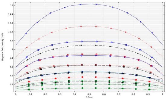 To compare each coil, two criteria were established: the shape of the magnetic field density at the center of the coil and the electric properties of each coil. The first criterion involved evaluating the magnetic field density relative to the coil’s length. This method allowed us to determine whether the magnetic field density inside the coil followed a horseshoe profile or remained constant along its length. The second criterion focused on the electrical properties, such as impedance, current, and induction, when different frequencies were applied to the solenoid.