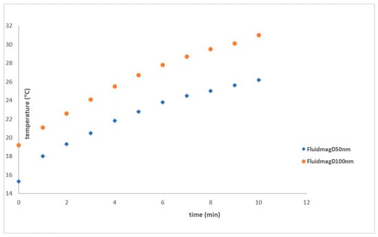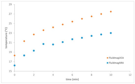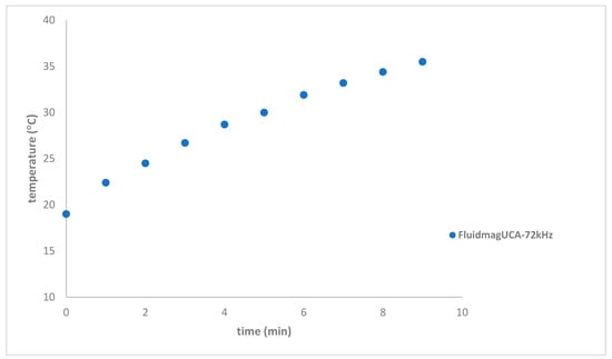Heating curves of FluidMagUCA at 72 kHz with a concentration of 12.5 mgMNP/mL using solenoid S8.