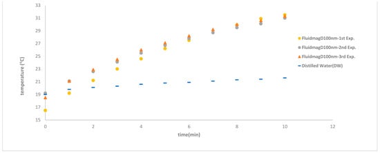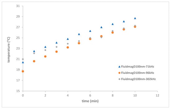 Regarding the MagFluidD100nm, the previous results were significantly affected, reinforcing the notion that the maximum temperature threshold was likely reached within the frequency range previously observed with coil S6 (see Figure 19).