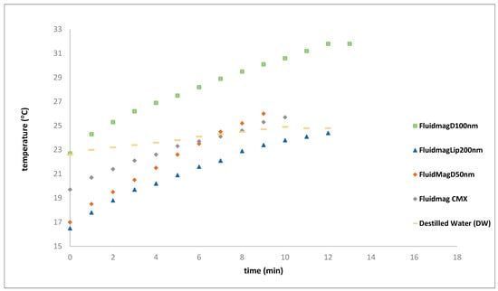 The initial examination of the developed magnetic hyperthermia (MH) system as presented in this article involved the use of commercially available MNPs. These MNPs were carefully chosen based on a comprehensive review of the literature, highlighting their positive results [25,26,27,28,29]. Their characteristics and designations are detailed in Table 3. Hence, seven different iron-oxide-based magnetic liquid samples from Chemicell GmbH (Berlin, Germany) were evaluated (Table 4), following studies by Kallumadil et al. [26]); Yaremenko, A.V et al. [30]; and Wang, Huang et al. [31]. These samples varied in size and core-shell configurations, all featuring a magnetite core. The MNPs had previously undergone comprehensive testing and characterization, particularly concerning their hydrodynamic diameters.