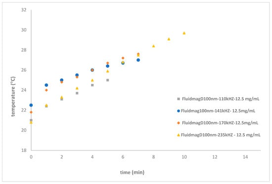 Heating curves of FluidMagD100nm at different frequencies with a concentration of 12.5 mgMNP/mL using solenoid S8.