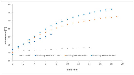 FluidMagDx50nm samples were used at different frequencies with a concentration of 25 mgMNP/mL in this new device configuration. As anticipated, the results improved, and the graph also shows the reference for the DW sample and the repeatability in this new configuration (see Figure 20). The SAR values were as follows: 3.55 W/gMNP at 302 kHz, 5.40 W/gMNP at 99 kHz, and 7.74 W/gMNP at 132 kHz. The optimal frequency was around 132 kHz. The Chemicell samples exhibit rapid heating under the 132 kHz applied magnetic field, consistent with the findings of Eggeman and co-workers [44], with the temperature notably increase at 132 kHz.