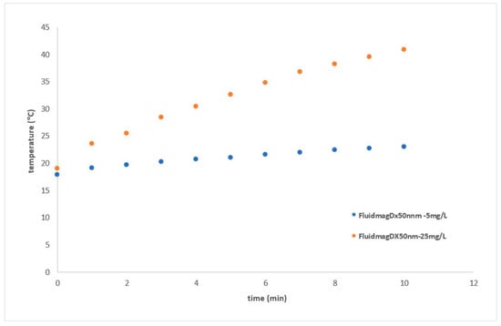 The heating curves for the two samples of FluidMagDX50nm are shown in Figure 21, as a function of average concentration (5–25 mg/mL). The Chemicell samples were heated using an applied magnetic field at 132 kHz, with a field amplitude of approximately 8 mT. The initial slope decreases when the sample is diluted from 25 mg/mL to 5 mg/mL, which aligns with the findings of [44]. Therefore, it appears that dilution does not improve the heating efficiency in this type of MNPs. As state previously, macroscopic dilution does not necessarily change the inter-particle distance within a cluster; it may only increase the average cluster spacing, as the MNPs are composed of clusters as described before.