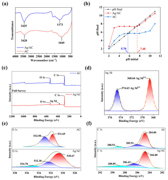 (a) IR spectra of AC and Ag/AC composite. (b) PZC value of AC and Ag/AC composite; (c–f) Full XPS (c), Ag 3d ((d), Ag/AC composite only), O 1s (e), and C 1s (f) high-resolution spectrum of AC and Ag/AC composite.