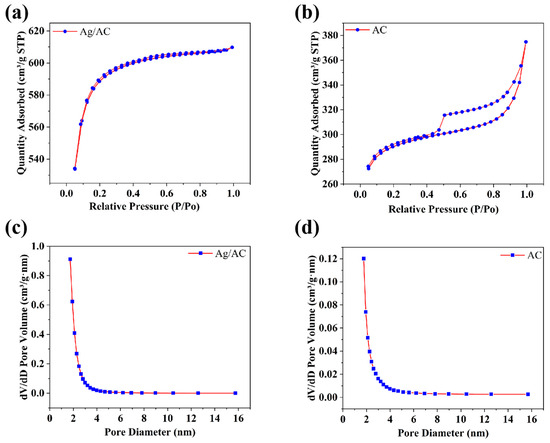 The nitrogen adsorption/desorption isotherms and pore size distribution experimental results, as shown in Figure 5 and Table 2, demonstrated that the incorporation of nanoscale Ag substantially enhanced the BET-specific surface area of the AC and significantly impacted its adsorption behavior. The AC without Ag loading exhibited a BET-specific surface area of 819.19 m2/g with an average pore size of 3.00 nm (see Table 2). Its adsorption isotherm could be interpreted as a mixture of Type I in the low-pressure range and Type IV in the medium- to high-pressure range, accompanied by an H4-type hysteresis loop, indicating its classification as a predominantly microporous and mesoporous adsorbent (see Figure 5b,d). Following the introduction of nanoscale Ag, the specific surface area was notably increased to 2025.96 m2/g, suggesting enhanced adsorptive capabilities. Simultaneously, the average pore size decreased to 2.14 nm, and the nitrogen adsorption profile closely approximated a Type I isotherm, indicating a shift toward a microporous adsorbent (see Figure 5a,c and Table 2).