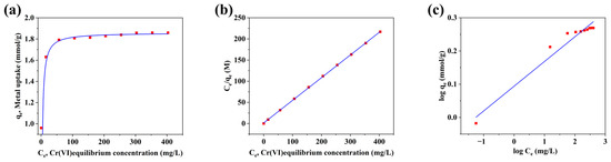 Adsorption isotherm of Ag/AC composite for Cr(VI): (a) experimental data, (b) Langmuir model, and (c) Freundlich model.