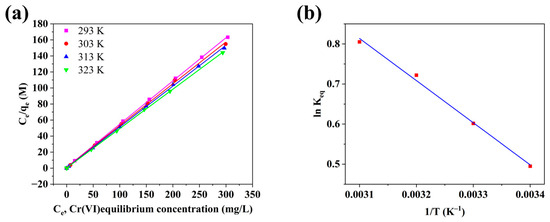 (a) Langmuir adsorption isotherms of Cr (VI) on Ag/AC composite materials at different temperatures. (b) Relationship between ln keq and 1/T.