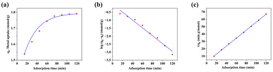 The WRN-based Ag/AC composite material also exhibited a favorable adsorption rate for Cr(VI). As shown in Figure 8a, equilibrium was achieved within 80 min for a 150 mg/L Cr(VI) solution. The experimental data were further analyzed using pseudo-first-order and pseudo-second-order kinetic models, with their linear forms shown in Figure 8b,c, respectively. The relevant fitting parameters and regression coefficients are detailed in Table 6. The results clearly show that the adsorption of Cr(VI) using the Ag/AC composite closely aligned with the pseudo-second-order kinetic model, suggesting that chemical adsorption was the main controlling factor.