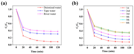 (a) Adsorption efficiency of Ag/AC composite for Cr(VI) in different water types. (b) Adsorption performance of Ag/AC composite for Cr(VI) after multiple adsorption–regeneration cycles.