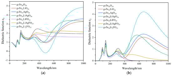 Figure 6 presents the optical parameter curves of the g-ZnO doping systems. During simulation calculations, the underestimation of the bandgap by the GGA necessitated the application of a scissors operator to correct for this error in analyzing the optical properties. As shown in Figure 6a, the real part of the dielectric function, , gradually decreases for each doping system until the wavelength exceeds 520 nm, at which point the of g-Zn14LiAgFO15 becomes larger than that of pure g-ZnO. The variation curves for single-Li-atom doping and single-Ag-atom doping are quite similar, with g-Zn15LiO16 exhibiting a smaller than g-Zn15AgO16 after 400 nm. Within the visible-light wavelength range of 380 nm to 780 nm, the four doping systems (g-Zn15LiO16, g-Zn15AgO16, g-Zn14LiAgO16, and g-Zn14Li2FO15) all exhibit a trough, where particularly notable is the negative value of for g-Zn14Li2FO15 around 440 nm. In Figure 6b, once the wavelength enters the visible-light range, the imaginary part of the dielectric function is greater than that of pure g-ZnO for all doping systems, except for g-Zn15LiFO15, whose remains smaller than that of pure g-ZnO throughout. Furthermore, these four doping systems—g-Zn15LiO16, g-Zn15AgO16, g-Zn14LiAgO16, and g-Zn14Li2FO15—display pronounced peaks in within the visible-light region, with g-Zn14Li2FO15 exhibiting a peak value approximately twice that of the other three systems.