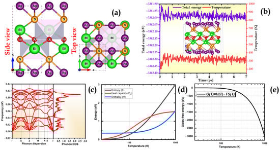 (a) Top/side view of BiAgOS crystal after relaxation, (b) top snapshot with the corresponding variation of the total energy between 0 and 7 ps during the AIMD simulations at 300 K, (c) the phonon spectra and PhDOS, (d) variation of entropy S, heat capacity CV, and enthalpy H as a function of temperature, and (e) variation of Gibbs free energy as a function of temperature.