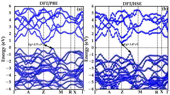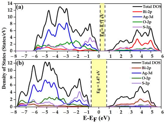 Furthermore, the band gap energy is one of the important characteristics of a photocatalyst material, as it needs to remain sufficiently separated to facilitate the water-splitting reaction under light excitation. The minimum theoretical bandgap energy range required for photocatalytic materials to drive the reaction is approximately 1.23 eV. According to our simulation, the electronic structure reveals an indirect transition upon excitation at the band gap. The density of states (DOS) and band positions were initially determined using the PBE approximation, revealing a bandgap of 0.71 eV, shown in Figure 2a. This underestimation of the bandgap was corrected using the HSE approximation, as depicted in Figure 2b. The band gap calculated for BiAgOS using the HSE06 function and spin–orbit coupling is approximately 1.47 eV.