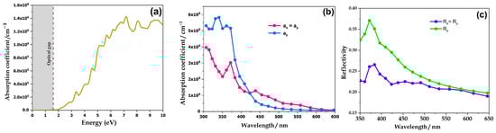 The response of electrons to a wave in a material is characterized by the complex dielectric constant ε(ω), where the imaginary component reflects the absorption of the material, while the real component is associated with the polarization of the medium. Using Equations (5) and (6), we calculated the absorption A, as well as the reflectivity spectrum R. The results are shown in Figure 4.
