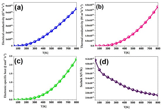 Computed thermoelectric properties of BiAGOS: (a) electrical conductivity, (b) thermal conductivity, (c) electronic specific heat, and (d) Seebeck coefficient as a function of temperature.