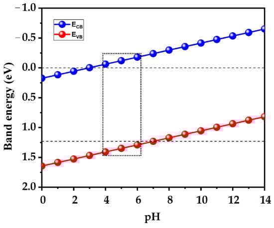 where χ is the Mulliken electronegativity, E0 (−4.5 eV) is the reference potential used to link the redox level to the vacuum, and Eg is the electronic band gap energy for BiAgOS calculated using HSE approximation [23]. Equation (13) allows us to obtain band edge potentials as a function of pH. This equation incorporates the Nernst relation to account for the pH dependence [24].