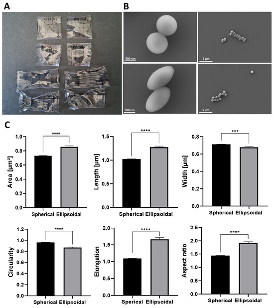 Thermo-induced polystyrene particle (0.8 µm) stretching. (A) The films of the non-stretched (top) and stretched (bottom) particles. The films were stretched to a stretch ratio of 2.5. (B) SEM images of the spherical (top) and ellipsoidal (bottom) PS particles. (C) Mean area, length, width, circularity, elongation, and aspect ratio of the spherical versus ellipsoidal particles. Bars represent experimental means; error bars show standard error (n = 76). Statistical significance was tested using an unpaired Student’s t-test, with the significance threshold set as p = 0.05 (***, p < 0.001; ****, p < 0.0001).