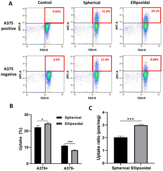 Flow cytometry analysis of cellular uptake of spherical and ellipsoidal polystyrene particles (0.8 µm) in A375 cells. (A) FACS plots and gating strategy used for uptake analysis. Control: Incubation with free-particle medium. (B) Uptake percentages measured by flow cytometry of spherical and ellipsoidal PS particles after incubation (overnight) in A375+ and A375− human melanoma cell lines. (C) The uptake ratio between A375+ to A375− for spherical and ellipsoidal particles. Control; no particles were added to the cells. Bars represent experimental means; error bars show standard error (n = 3). Statistical significance was tested using an unpaired Student’s t-test, with the significance threshold set as p = 0.05 (*, p < 0.05; ***, p < 0.001).
