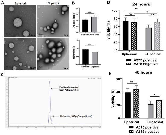 Selective killing of A375 positive cells via paclitaxel-loaded ellipsoidal particles. (A) TEM images of the spherical and ellipsoidal paclitaxel-loaded ~200 nm PLGA particles. (B) Mean aspect ratio and roundness of the spherical versus ellipsoidal particles. Analysis was performed using ImageJ. (C) Representative HPLC chromatograph which shows the results from HPLC purification experiment after paclitaxel extraction from PLGA particles. Reference shows peak obtained from paclitaxel standard solution (500 μg/mL), whereas the taller peak shows the amount of paclitaxel extracted from the PLGA particles. In this chromatograph, the peak corresponds to a concentration of 975 μg/mL of paclitaxel. (D) MTT assay results show A375 positive and negative cell viability after 24 h of incubation with spherical and ellipsoidal paclitaxel-loaded particles. (E) MTT results after 24 h incubation with paclitaxel-loaded particles followed by particle removal and an additional 24 h incubation in particle-free medium. Bars represent experimental means; error bars show standard error (n = 3). Statistical significance was tested using an unpaired Student’s t-test, with the significance threshold set as p = 0.05 (ns—nonsignificant, p > 0.05; *, p < 0.05; **, p < 0.01; ****, p < 0.0001).