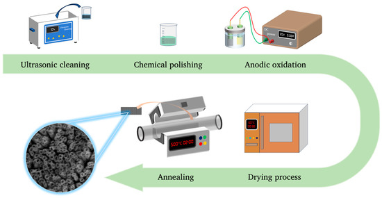 The Ti mesh was firstly washed with acetone and deionized water for 10 min, respectively, with ultrasound-assisted cleaning. Then, the Ti mesh was immersed in the polishing solution for chemical polishing and thrown into deionized water to undergo the quenching reaction. The polishing solution was prepared by mixing deionized water, HF and HNO3 (V:V:V = 2:1:1). Titanium dioxide nanotube arrays (TiO2NTAs) were prepared by anodizing. The electrolyte was prepared using EG and H2O (V:V = 2:1), and NH4F (KF or NaF) was the solute whose concentration was 0.175 mol/L. The Ti mesh was the anode and the platinum mesh was the cathode. The distance between the electrode surfaces was 3 cm. The set voltages were 10 V, 20 V, 30 V and 40 V with the DC power supply (IT6823), which was purchased from ITCH Electronic Co., Ltd. (Nanjing, China). The oxidation times were to 20 min, 40 min, 60 min, 80 min, 120 min and 180 min. After anodizing, the Ti mesh was washed with deionized water 3 times to remove the solute and solvent on the surface of the Ti mesh. Subsequently, the Ti mesh was dried in an oven for 30 min at 60 °C. Then, the Ti mesh was calcined at 500 °C (also known as the annealing treatment) in a tube furnace for 2 h with the quiescent air at a heating rate of 3 °C/min (The TiO2NTA preparation process detailed in Figure 1). After annealing, natural cooling was performed and the cooling time varied with the ambient temperature. According to the above experimental parameters, we prepared three groups of samples by changing other treatment methods (electrolyte, anodizing time and chemical polishing time) for Ti mesh. Finally, all samples were put in 5 mL test tubes for data measurements.