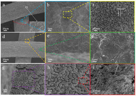 Figure 2 shows the SEM image results of the samples in different electrolytes. We selected a series of electrolytes (KF, NaF and NH4F) to anodize the Ti mesh. The images indicate the following: (i) When the electrolyte is KF (Figure 2a–c), there are only TiO2 nanotubes on the intersection of two Ti wires, and the diameter of these nanotubes is approximately 100 nm in average (Figure 2c). In addition, the difference between them is that the morphology of the nanotubes prepared by KF is malformed (Figure 2c). (ii) When the electrolyte is NaF, there is no nanotube structure, not only on the surface of the Ti mesh, but also in the intersection, by just a few dents (Figure 2d–f). (iii) When NH4F is the electrolyte, a large number of nanotubes (Figure 2g–h) appear on the surface of the Ti mesh. However, the nanotubes are disorderly (Figure 2i), which may be due to the excessively long anodizing time leading to a nanotube length that is too long and a broken structure. Then, we adjusted the anodizing time to explore the appropriate time.