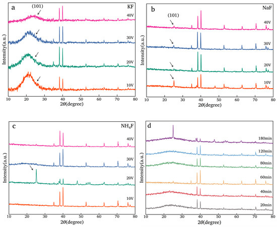 When the electrolytes are NaF or KF, the intensity of the characteristic peak of TiO2 near 25.28°, attributed to the (101) crystallographic plane, is almost weak (Figure 5), which may have been caused by the crystallization of the dense TiO2 film on the surface of the Ti mesh after annealing. When KF is selected as the electrolyte (Figure 5a), there is an obvious and broad peak near 25.28°, which indicates that the amorphous substance is produced. When the electrolyte is NH4F and the voltage is 20 V (Figure 5c), the intensity of the characteristic peak of TiO2 near 25.28°, attributed to the (101) crystallographic plane, is extremely strong compared to the other samples.