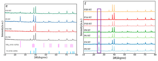 (a–c) XRD results of TiO2NTAs prepared by different electrolytes: (a) KF; (b) NaF; (c) NH4F. (d) XRD results of TiO2NTAs prepared by different anodizing time. (e) XRD results of P0-TM, P10-TM, P0-NT and P10-NT. (f) XRD results of TiO2NTAs prepared by different polishing time.