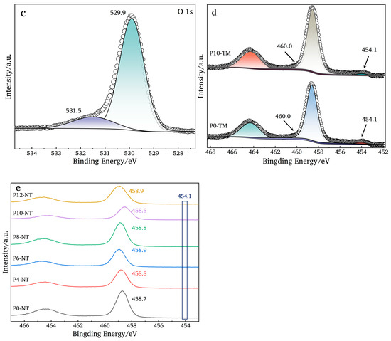 (a–c) XPS energy spectra of sample P10-NT ((a) full spectrum; (b) Ti 2p; and (c) O 1s); (d) Ti 2p fine spectrum of P0-TM and P10-TM; (e) Ti 2p fine spectrum of TiO2NTAs in different chemical polishing times.